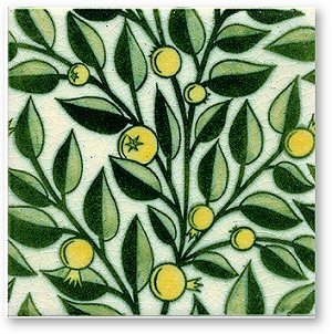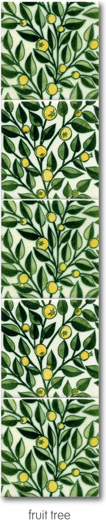 shown here. The fruit tree design is taken from designs De Morgan created while at Merton Abbey between 1882 and 1887. The repeating floral pattern over two tiles can be used in fireplace panels although each tile is so full of life it is beautiful as an individual piece. Our tiles are