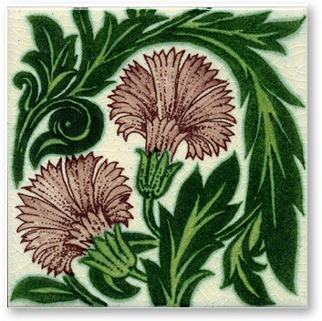 - 8mm thick. De Morgan's stylised carnation design is reminiscent of William Morris's flowery designs. This is an example of many variations based on the carnation and can be used as an individual piece or as a fireplace tile.