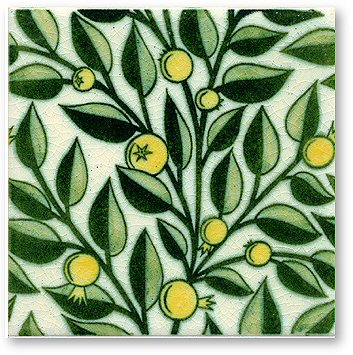 - 8mm thick. The fruit tree design is taken from designs De Morgan created while at Merton Abbey between 1882 and 1887. The repeating floral pattern over two tiles can be used in fireplace panels although each tile is so full of life it is beautiful as an individual piece.