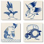 Philip Webb wall tiles: magpie, crane, cockerel, hen and