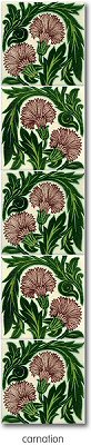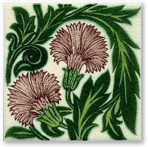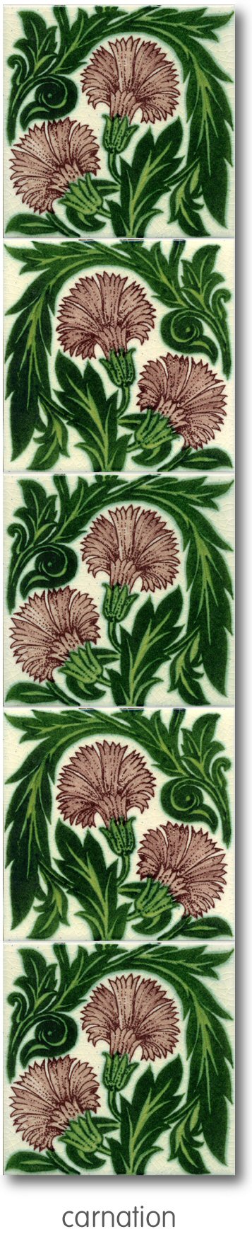 shown here. De Morgan's stylised carnation design is reminiscent of William Morris's flowery designs. This is an example of many variations based on the carnation and can be used as an individual piece or as a fireplace tile. Our tiles are