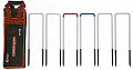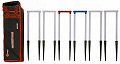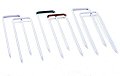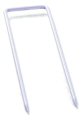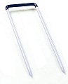 A standard set of croquet hoops comprises 4 white hoops, 1 red hoop, and 1 blue hoop. Generally speaking, there are two types of croquet hoop: tournament hoops, and garden hoops. The difference between these two types is not size, but construction, and ease of use. Tournament hoops are made to be less flexible (and hence less forgiving), and are therefore often made from cast iron, and the part that is driven into the ground is often in the form of a carrot, which helps to provide greater stability and improved reliability of the hoop width. The problem with tournament hoops, especially for garden use, is that they are much more expensive, and they are difficult to set up properly, especially if they are not being used on a perfect croquet lawn. In most gardens, you will find, unless a proper hoop drill is used, the gap often becomes too narrow by the time the hoop is driven in, and the game becomes too difficult. Wire hoops, however, of the type shown here are far more practical for garden and family use, and much cheaper!
