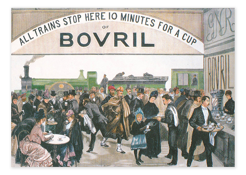 Postkarte - BOVRIL TRAIN STOPS HERE. Art.-Nr. 01BR03. Unser Angebot an Postkarten besteht aus über 300 Karten, die Ihnen einen unvergleichlichen Einblick in die Geschichte britischen Konsumverhaltens bietet.