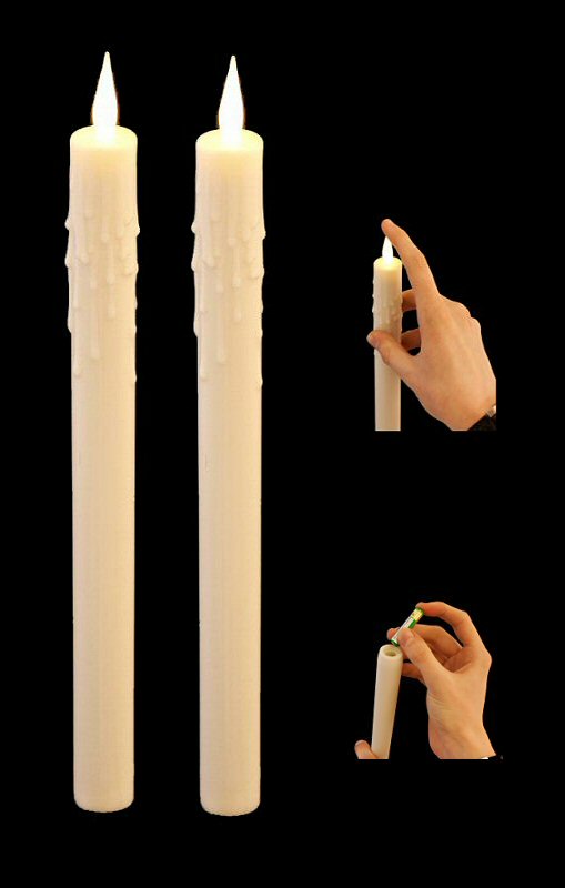 Batteriebetriebene LED- Kerzen mit einem „warmen“ weißen Flackern, erhältlich im Zweierpack; die Batterien sind im Lieferumfang enthalten. Diese Kerzen werden Ihnen viel Freude bereiten! Die überall erhältlichen Standard- Batterien sind bereits eingebaut. Schalten Sie einfach die Kerzen an, indem Sie auf die Flamme drücken und staunen Sie über das Ergebnis! Raffinierte Kerzentechnolgie mit LEDs und intelligenter Elektronik, um ein lang anhaltendes und täuschend echtes Licht zu erzeugen, das eine normale Wachskerze perfekt simuliert. Jede dieser Kerzen erzeugt ein einladendes Licht, fern von jeglichem Stress. Durch den Gebrauch von LED- Technologie- das heißt eine Art von Licht, das keine Hitze erzeugt- kann keine Brandgefahr erzeugt werden. Die Kerzen benötigen keine Pflege, sind sauber und erzeugen keinen Rauch oder Ruß. Außerdem können Sie nicht durch den Wind gelöscht werden. Dadurch, dass die Kerzen aus Silikon sind, wirken sie sehr realistisch und sind zudem auch noch ziemlich bruchsicher, so dass sie normalerweise nicht kaputt gehen, sollten sie auf den Boden fallen. Diese Kerzen sind so gestaltet, dass sie wie echte Kerzen aussehen, die gerade anfangen zu schmelzen. - Täuschend echt!