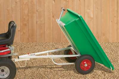 Strong tipping handle for easy operation. Fitted with a clevis hitch. Additional 50mm Ball coupling also supplied with this model. Height 84cm, width 84cm, length 184cm. Level capacity 210ltrs/7.4 cubic feet, Weight 37.5kg. Large 40cm 4 ply pneumatic tyred wheels. - Moves clippings, leaves, pots, logs, paving and tools, and