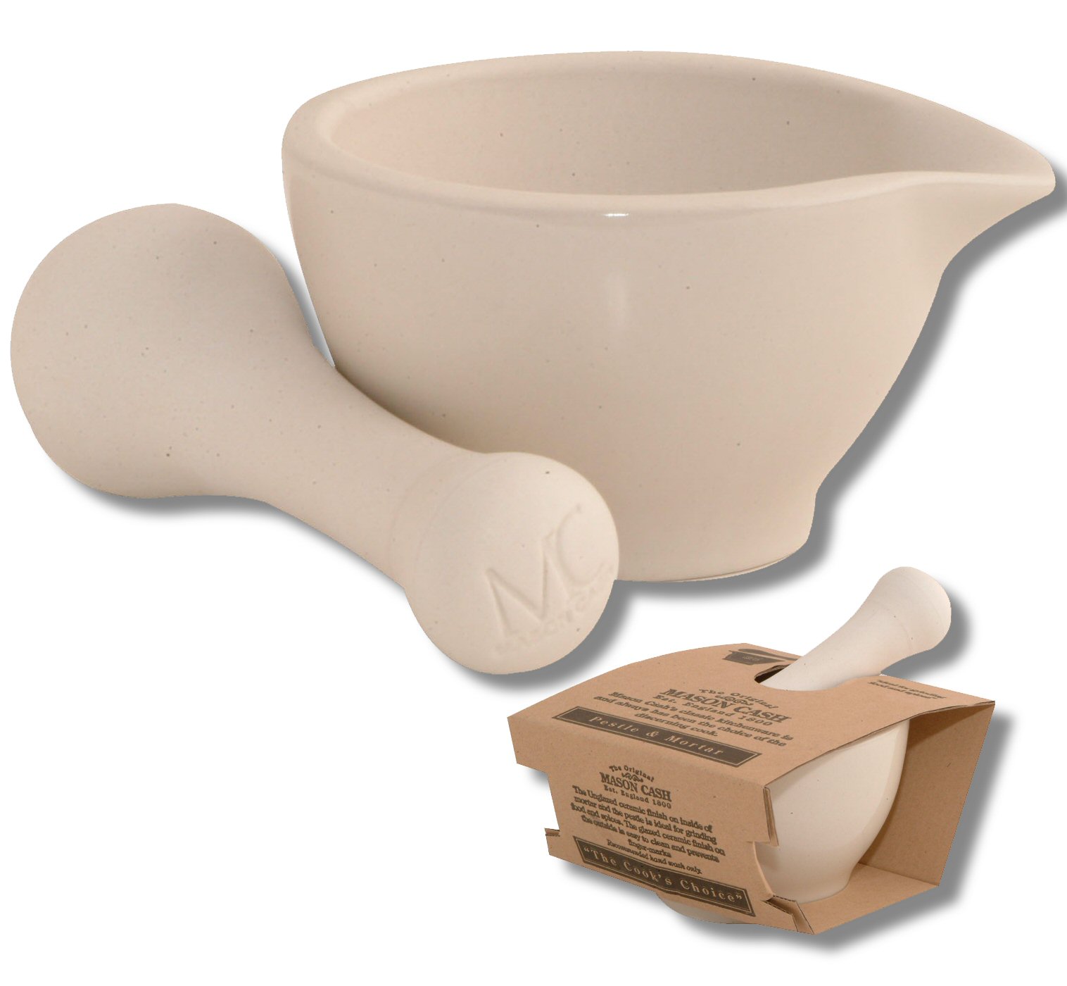 We have looked far and wide for a Mortar & Pestle that we can really recommend - too often we have found poor-quality versions that either grind themselves as well as their contents, or stain easily and are not very durable, or even don't grind properly! At last, however, we have uncovered a mortar and pestle set that we are very happy to recommend. The Mason Cash Mortar & Pestle is the simplest and best way of grinding and crushing herbs and spices. It is a classic design that is based on the original high-quality models produced over 200 years ago. The first fully vitrified ceramic Mortars and Pestles were made by the famous English Potter Josiah Wedgwood in around 1800 to overcome the problem of acids attacking marble mortars and the contamination of wooden ones. At the time his nephew Ralph was Manager of the Pottery in Derbyshire where Mason Cash now make all their Mortars & Pestles to a design very similar to that of his uncle. Some people are surprised that Derbyshire has a tradition of ceramic manufacture. However potteries were founded where good clay and coal were found and, as a result, there was once significant pottery business in South Wales, South and West Yorkshire, Lancashire and Scotland. In more recent years many of those areas have lost their potteries - Mason Cash, however, continues to make traditional products, using traditional, local materials wherever possible. Note: Just in case you were wondering, the Mortar is the bowl, and the pestle is the grinding tool.