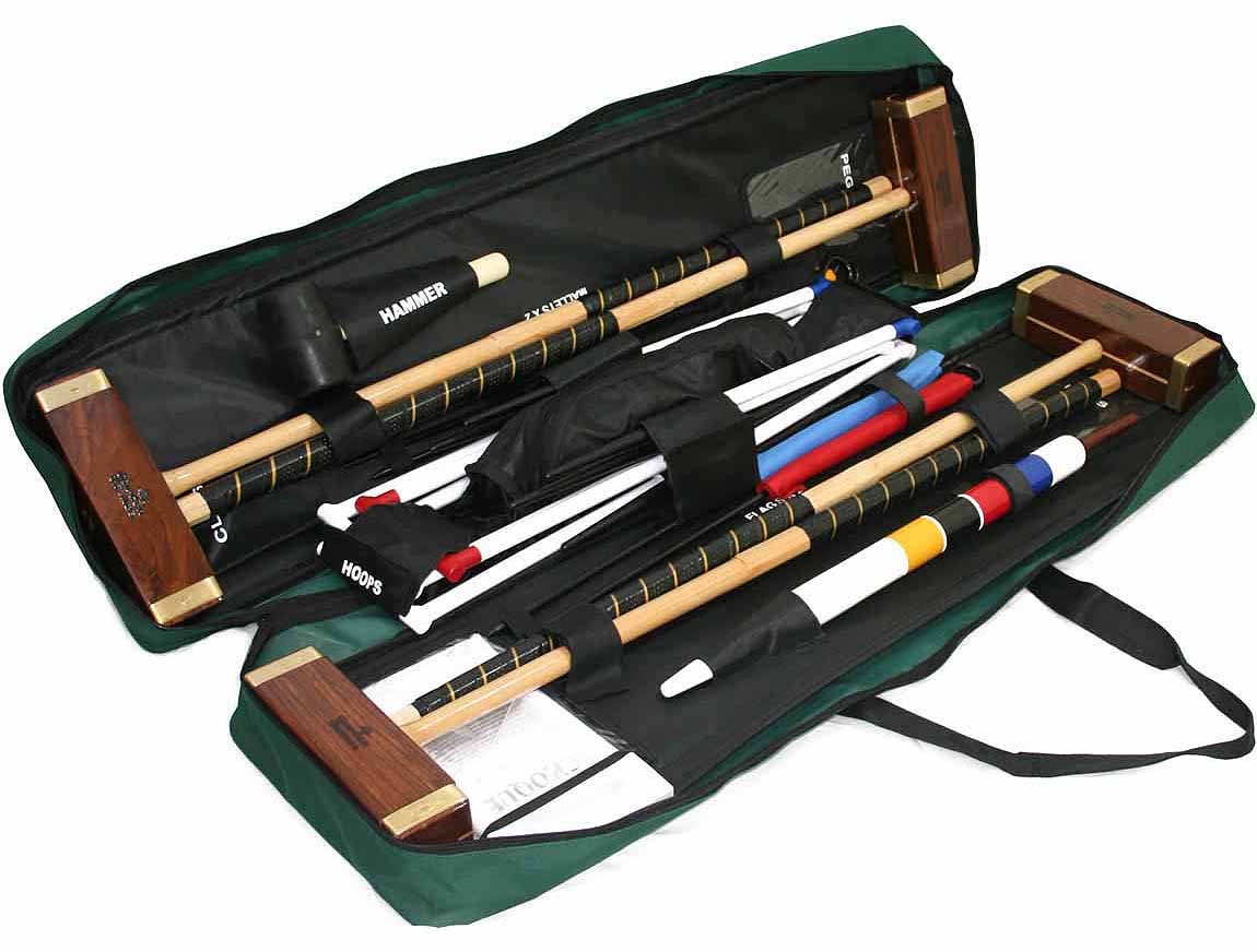 An excellent value, full-sized 4 player croquet set, with all the equipment necessary for a good game in the garden. Includes 4 full-sized natural hardwood mallets with leather-bound handles, Full-size 16 oz balls, steel hoops, hoop mallet, corner flags and pegs, plastic clips, hardwood winning post and rules. Packed in a durable bag.. - Full Croquet Set