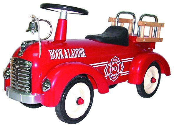 Handbuilt foot-to-floor ride-on car in strong steel, with chome fittings, smooth-running rubber tyres. A beautifully-finished vehicle in fire-engine red, ideal for any young, brave fireman. Suits 1 to 3 years old. - Based on original 1950s designs