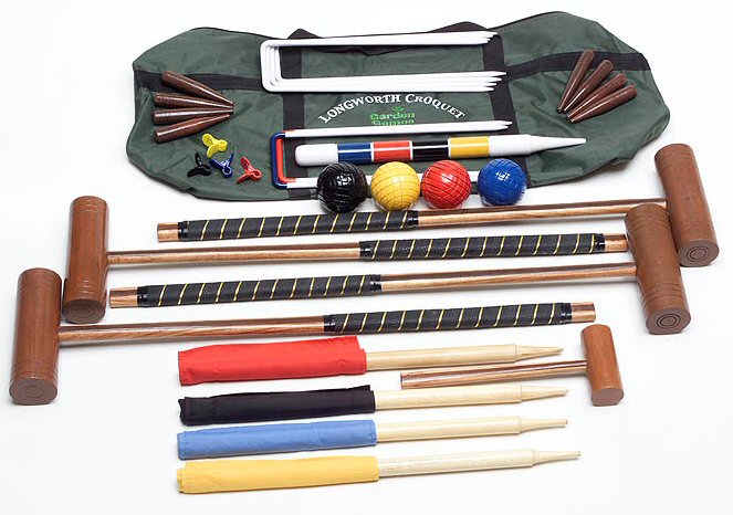 An excellent value, full-sized 4 player croquet set, with all the equipment necessary for a good game in the garden. This is probably the cheapest full-sized set available. Includes 4 full-sized natural hardwood mallets with leather-bound handles, Full-size wooden 12 oz balls, steel hoops, hoop mallet, corner flags and pegs, plastic clips, hardwood winning post and rules. Packed in a zip-fastening nylon bag with shoulder strap for portability. - Ideal Family Set