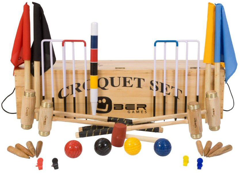 The Uber Games Junior Executive Croquet Set is probably the best junior quality croquet sets we have seen, with features normally found on full-size sets, such as English Ash mallets with brass protection rings. It is a well-crafted, durable set, constructed using high quality materials. English Ash mallets with brass protection rings and leather-bound handles, junior wooden balls, solid steel hoops, rubber head hoop mallet to protect hoops, corner flags, yard markers, croquet clips and hardwood centre peg. The set can be purchased alone, or with various storage options (bags, wooden box etc). What we particularly like about this set is the level of quality achieved at this price level. - High-Quality Croquet Set